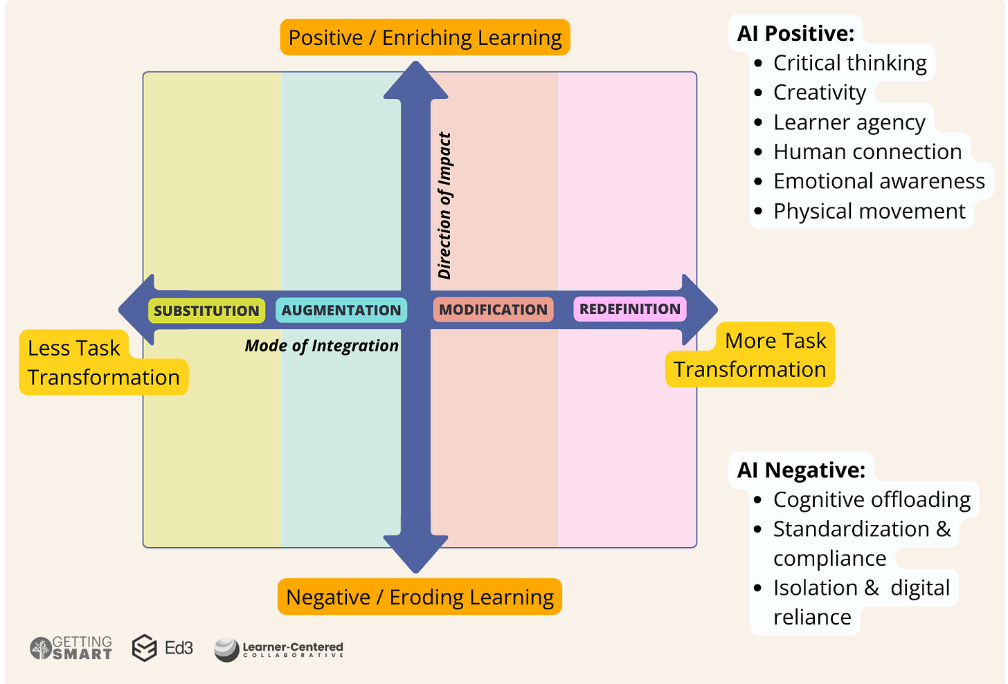 With AI, the sophistication of a task tells us very little about the quality of learning. Substituting an analog task with a digital tool can be constructive if it frees teachers for presence, feedback, and relationship. The very same substitution can be corrosive if it replaces those moments altogether. The difference is the direction of impact that AI pushes the system; whether AI expands human capacity or replaces it, whether it builds agency or outsources it. (Read more about the reframing of SAMR here.)